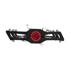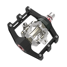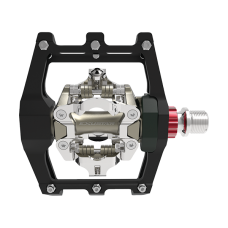 A pedal featuring a pop-up binding for easy cleat engagement. This pedal is built on a rigid, a CNC-machined aluminum frame, anti-slip grip pins, smooth running mechanism consisting of a Cr-Mo axle and a slimline dual bearing system.