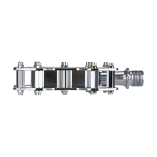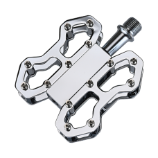 A pedal featuring a stainless steel platform, a strong CNC-machined aluminum body, with a machined Cr-Mo axle, and anti-slip pins.